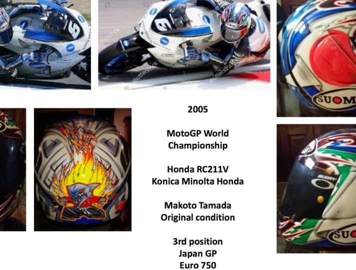 Le casque Suomi original porté par le Japonais Makoto Tamada lors de la saison MotoGP 2005, avec la Honda RC211V du Konica Minolta Honda Team. Plus précisément, le casque disponible a été utilisé lors du GP du Japon à Motegi, lorsque Tamada a terminé troisième. Bon état général. Pour info et achats écrivez à [email protected]
