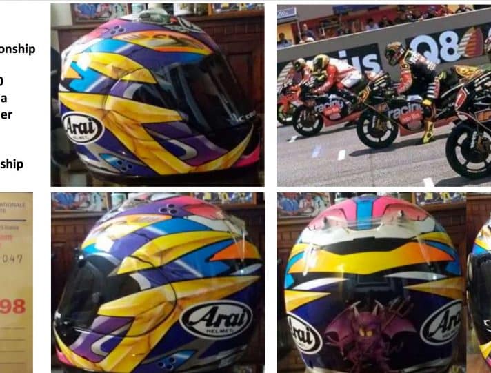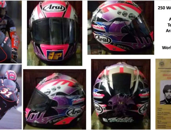 Dans ce lot, il y a un casque Arai Factory porté par Tetsuya Harada lors du Championnat du Monde 250GP 1998 en tant que pilote Aprilia officiel. Il y a aussi un casque jet que le pilote japonais a utilisé pour ses mouvements dans le paddock. L’ensemble est en vente : un casque de course plus un casque jet. Pour info et achats écrivez à [email protected]