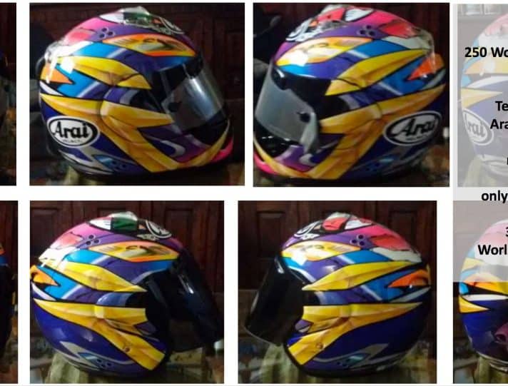 Le casque Arai porté par le Japonais Tetsuya Harada lors de la saison du Championnat du Monde 250 1997 est à la disposition des lecteurs de Corsedimoto. Harada était un pilote Aprilia officiel et a terminé le championnat à la troisième place. Tetsuya était aussi l’un des pilotes d’usine d’Arai. Pour info et achats écrivez à [email protected]