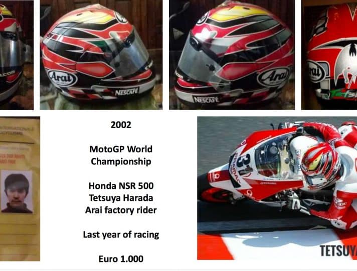 Offre du casque Arai porté par Tetsuya Harada lors du championnat MotoGP 2002. Au cours de cette saison, le pilote japonais a piloté la Honda NSR500 officielle. Le casque est « usine » Arai. La pièce a une valeur particulière, car 2002 a été la dernière saison de Harada. Pour info et achats écrivez à [email protected]