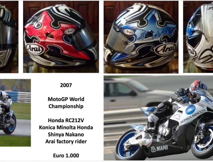 Disponible pour les lecteurs de Corsedimoto, le casque Arai porté par le Japonais Shinya Nakano lors de la saison MotoGP 2007. Nakano pilotait la Honda RC212V du Konica Minolta Honda Team. Le casque proposé est le casque Arai « usine ». Pour info et achats écrivez à [email protected]