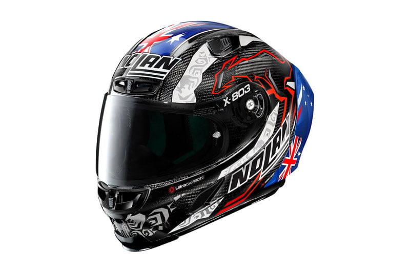 Le nouveau casque X-803 RS Ultra Carbon Casey Stoner 10th Anniversary arbore tous les éléments qui ont toujours accompagné la légende de la course moto internationale dans les 176 courses de sa carrière : Le drapeau australien, le logo de Casey, le numéro 27 et les kangourous.