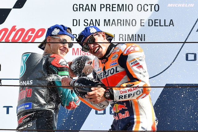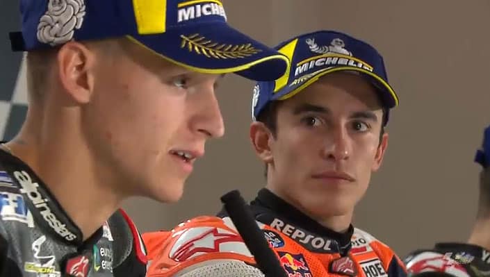 Fabio Quartararo : « oui, bien sûr cela a été une course très rude. Je savais qu’il allait essayer de faire quelque chose dans le dernier tour. Vous savez, quand vous avez inscrit « Marquez +0,2 » sur le tableau de bord durant 20 tours, ce n’est pas facile, mais finalement je n’ai pas commis de grosse erreur même si parfois j’ai raté le point de corde de certains virages. Mais la bonne chose, c’est qu’il nous a doublé au premier virage et que nous avons pu le repasser au virage 4, et que nous nous sommes battus pour la victoire jusqu’au dernier instant. Oui, aujourd’hui me battre en course avec lui a été le meilleur moment de ma vie et j’espère avoir encore beaucoup de moments comme cela durant cette saison. »