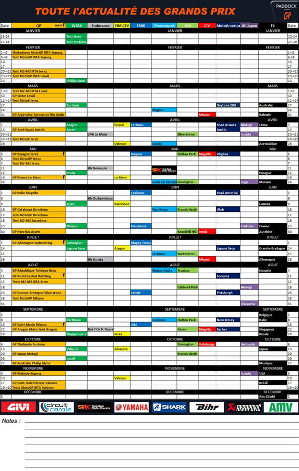 Comme chaque année, nous vous présentons notre calendrier exclusif regroupant les 10 principaux championnats de vitesse moto sur une seule page.