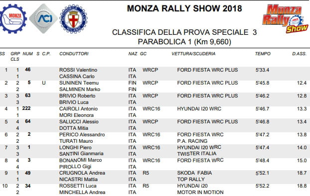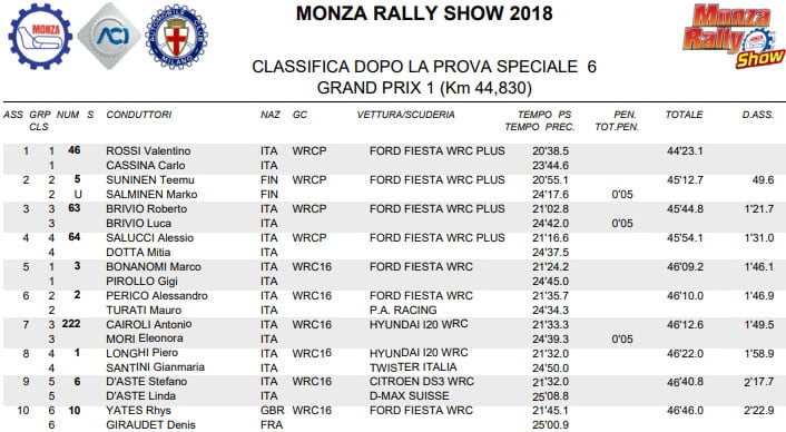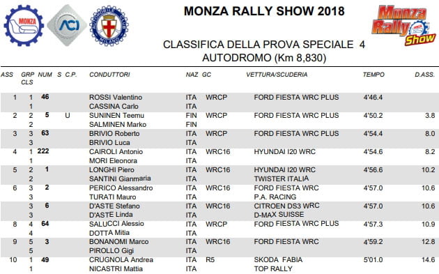 Valentino Rossi précède Teemu Suninen de 12,4 secondes et Roberto Brivio de 12,8. Tony Cauroli, 4e, arrive à placer sa « simple » WRC 1.6 devant la 4e WRC PLUS de Alessio « Uccio » Salessi.