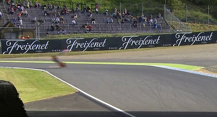 Dani Pedrosa est déjà dans un avion en direction de l’Espagne où l’attend l’incontournable docteur Mir qui recollera les morceaux. Eugène Laverty, lui, est encore au Japon, à l’hôpital, où il subit un scanner. L’Irlandais a chuté dans le virage 6 et a joué au pantin désarticulé un moment dans le bac à graviers. Evacué sur une civière, on soupçonne une commotion cérébrale pour le pilote Aspar.