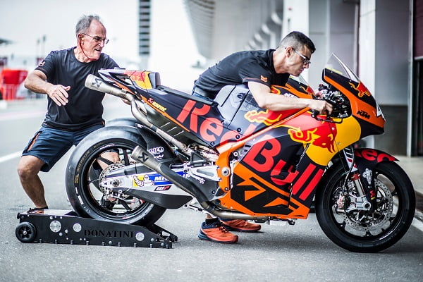 L’élément qu’il est le plus facile de modifier en cours de saison est le moteur, KTM en tant que nouveau venu n’étant pas limité, et pouvant faire autant d’essais que souhaité. Après avoir clamé haut et fort que le screamer (explosions éloignées) était plus performant que le big bang (explosions rapprochées), KTM s’est rendu compte que pour réduire les 30 secondes de retard à la fin du Grand Prix, il faudrait peut-être essayer ce fameux big bang, ne serait-ce que pour mieux utiliser les pneus Michelin.