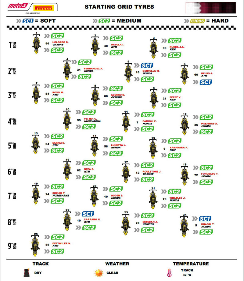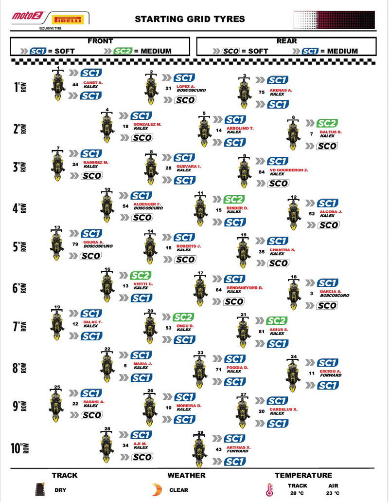  Les choix en Moto3™ ont été plus linéaires et unanimes, la quasi-totalité des pilotes ayant choisi les combinaisons SC2+SC2 comme gommes avant et arrière. Seuls Matteo Bertelle (Rivacold Snipers Team /