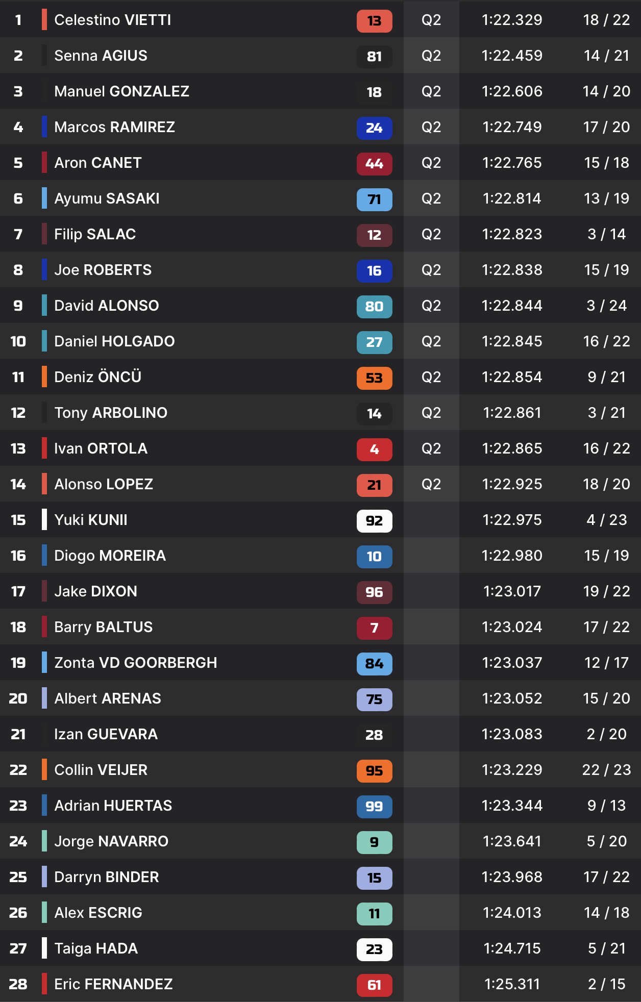 Celestino Vietti vient cependant bousculer la hiérarchie quatre minutes plus tard, avec une nouvelle référence posée en 1:22.329. C’est alors que les choses s’accélèrent. Peu après la tentative de l’Italien, Aron Canet se promeut dans le top-5 pour la première fois du week-end, avec le quatrième temps provisoire. De quoi se mettre à l’abri pour la Q2.