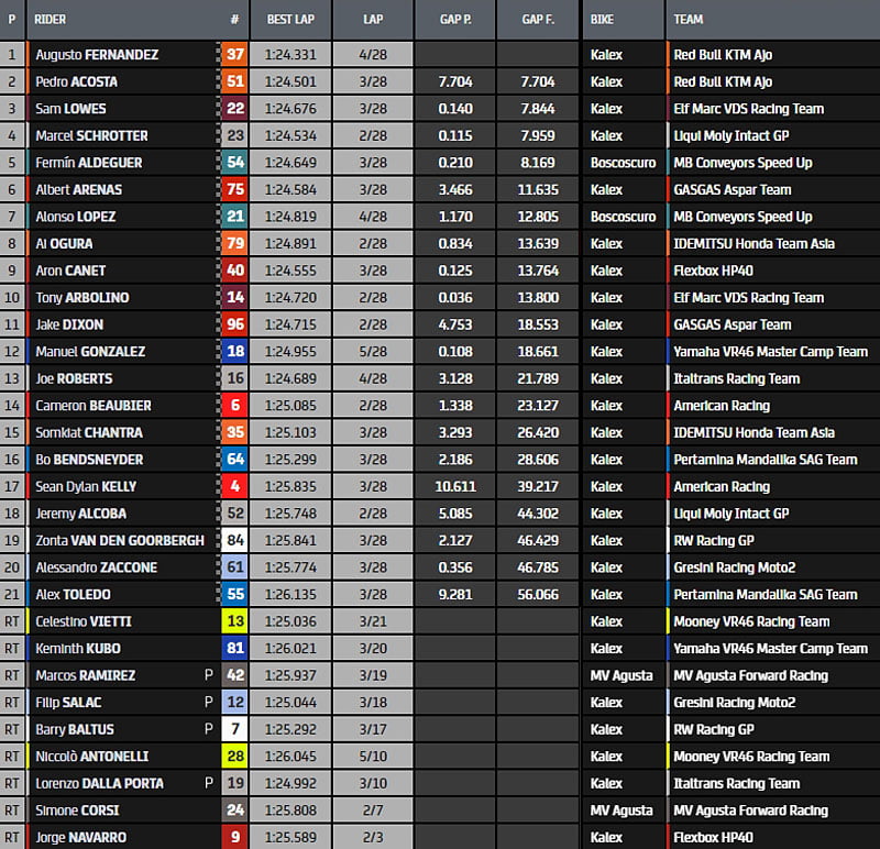 Au fil des tours, Augusto Fernández s’échappe irrémédiablement devant un peloton toujours emmené par Sam Lowes devant Pedro Acosta, Marcel Schrötter, Albert Arenas, Arón Canet, Fermín Aldeguer (Boscoscuro, Speed Up Racing, #54) et Alonso Lopez (Boscoscuro, Speed Up Racing, #21) alors que le leader du championnat, Celestino Vietti, n’apparaît qu’en 14e position.