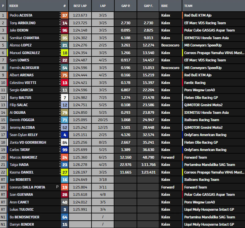 Pedro Acosta fait tout de suite le forcing et bat le record du meilleur tour en course. Il emmène dans sa roue Tony Arbolino et les deux hommes commencent à se détacher du peloton maintenant emmené par Arón Canet.