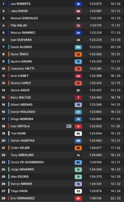 À quelques minutes de la fin du temps imparti, l’Américain détient toujours les commandes. Il devance alors Dixon est Gonzalez. Le top-13 se tient cependant en 3 dixièmes.