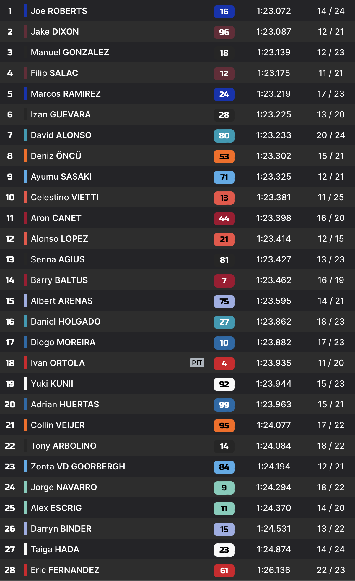 Au cours de la séance, deux pilotes lui prendront les commandes. Celestino Vietti fut le deuxième pilote de la séance à prendre la tête provisoire, en 1:23.381. Joe Roberts le suivra, quelques minutes plus tard, en 1:23.072. S’ils n’ont pas pris la tête de la FP1, des pilotes comme Jake Dixon, Filip Salac et David Alonso ont également affiché une grande forme.
