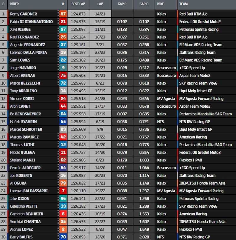 Alors que les cinq dernières minutes approchent, le leader du championnat Remy Gardner met la référence à 1’24.873. L’Australien est le seul sous la barre des 1’25 au tour. Il est tout de même rejoint peu après par Fabio Di Giannantonio.
