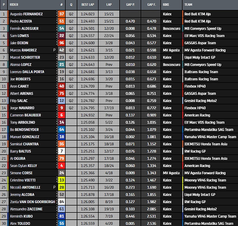 Quatrième Filip Salac (Gresini Racing) devant Albert Arenas (GASGAS). Sixième position pour Kalex (American Racing) de Cameron Beaubier, suivi de Sam Lowes (Marc VDS). Huitième était le rookie Pedro Acosta (Red Bull KTM Ajo) avec Jake Dixon (GASGAS) et Fermin Aldeguer (MB Conveyors Speed Up) pour fermer le Top 10 de la feuille des temps.