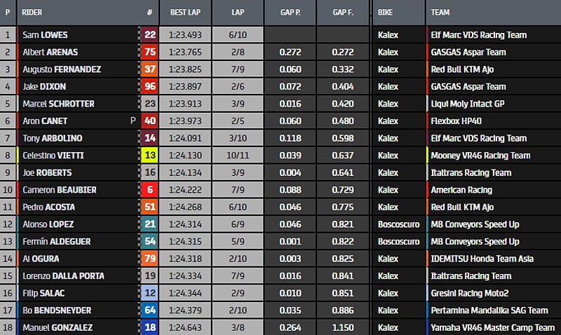 Résilience serait le mot qui qualifierait le mieux le solde Espagnol : « c’est quelque chose qui vient de ma famille. Je gère bien la douleur, à l’intérieur je peux mourir, mais à l’extérieur, des sourires et rien ne fait mal ici. C’est quelque chose que je porte dans l’ADN de Canet et bien, je remercie ma famille car nous sommes tous comme ça à la maison. C’est la moto dans sa forme la plus pure » termine Aron Canet.