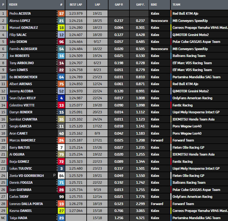 Acosta accélère encore en passant la barre des 1’24 en 1’23.979. Le pilote Ajo fait la différence dans le dernier secteur. Sous le drapeau à damier, Acosta garde l’avantage devant Lopez à plus de deux dixièmes, Gonzalez, Salac et Dixon qui ferme le top 5 à Aldeguer. Arbolino est huitième. Canet est 18è et donc et donc hors de la Q2, au contraire de Vietti 14è et dernier qualifié provisoire.