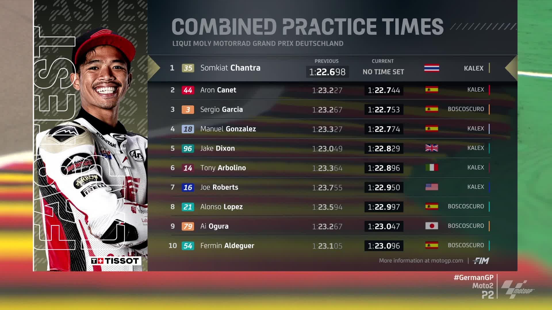 Après avoir dominé la P1, l’homme fort du vendredi du GP d’Allemagne, Somkiat Chantra, est parti à la faute dès les premiers instants de la séance. Si l’incident a compromis sa séance, le chrono qu’il a enregistré la veille lui a permis de revendiquer la tête du tableau jusque dans les derniers instants de cette séance de roulage.