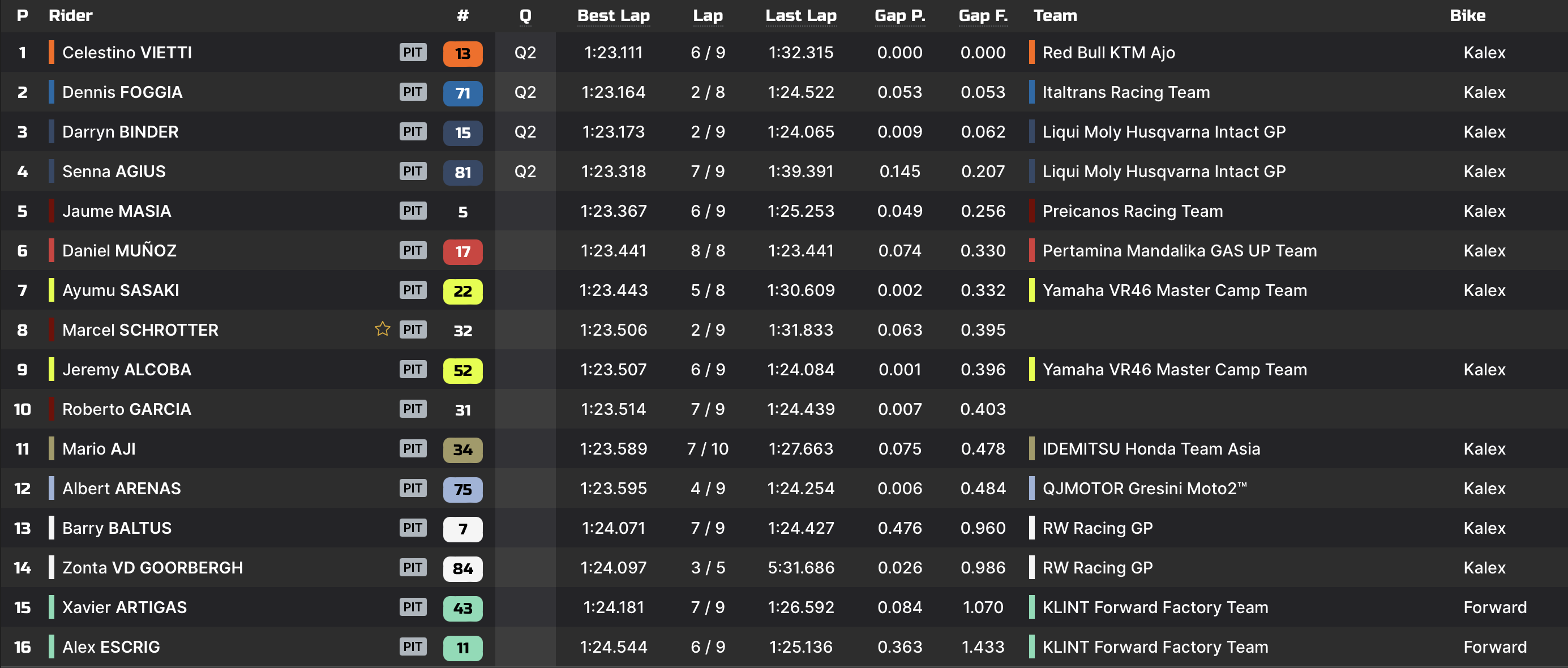 | Q2 | 1’23.858 Pedro Acosta | 1’22.778 Celestino Vietti |