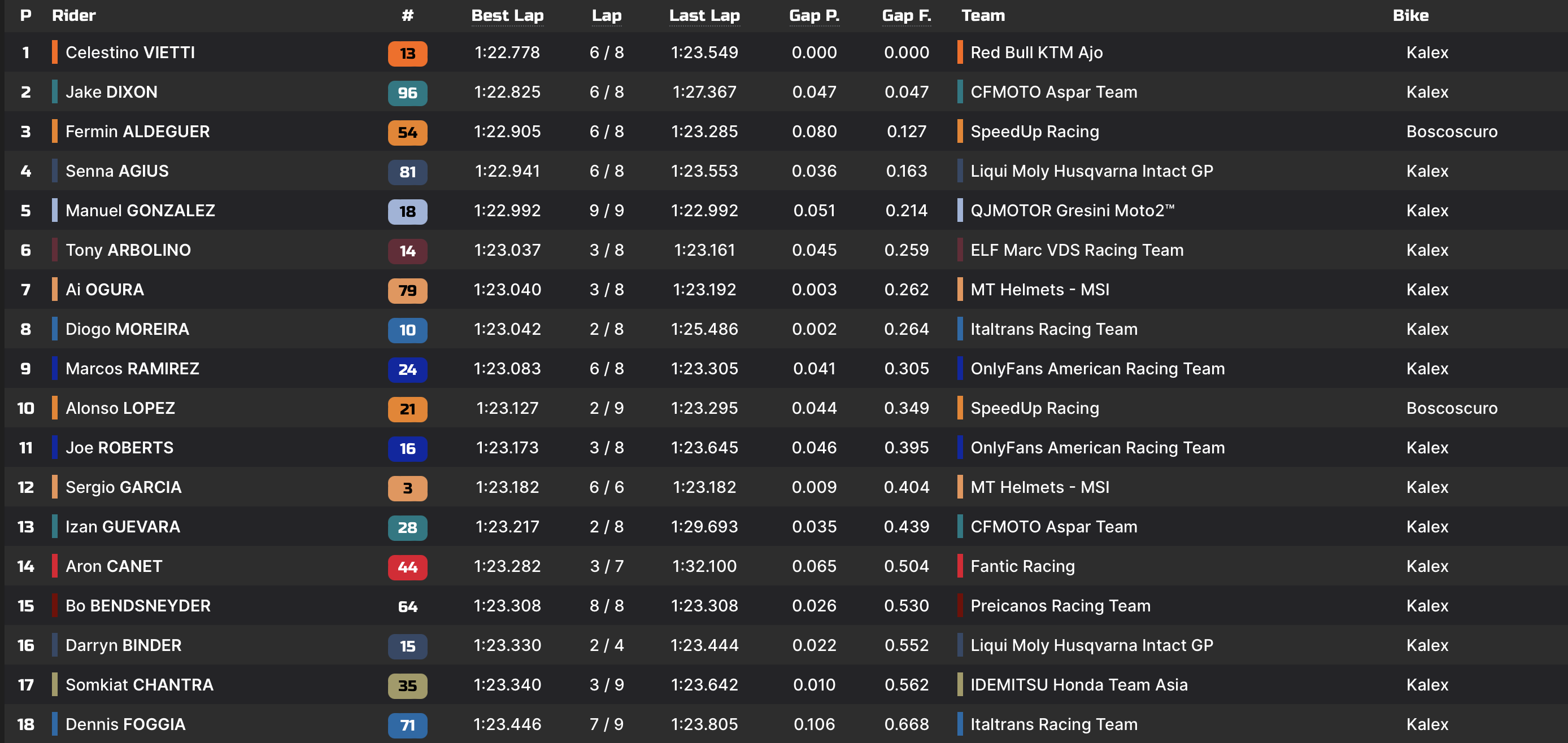 Jake Dixon et Fermin Aldeguer conservent leur statut et prendront le départ du Grand Prix depuis la première ligne. Tony Arbolino chute à la sixième place après avoir établi la première marque de référence. Ai Ogura réalise une qualification quelque peu décevante, et ne se classe que septième. C’est également le cas pour Alonso Lopez qui ne revendique que la dixième position.