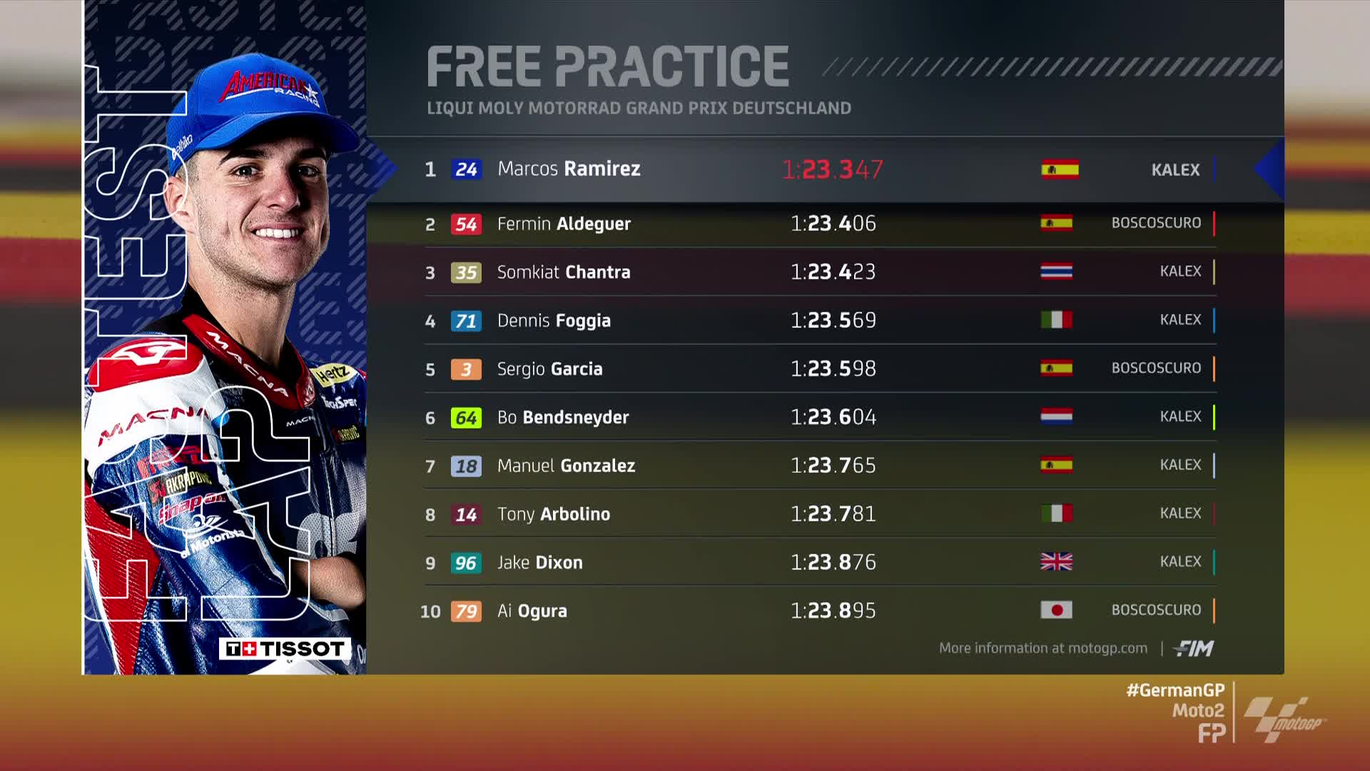 P1 and a new lap record for @24Marcosramirez in #Moto2 FP👊@Aldeguer54 and @somkiat35 complete the Top 3 👀#GermanGP 🇩🇪 pic.twitter.com/DtGS3VjzA5