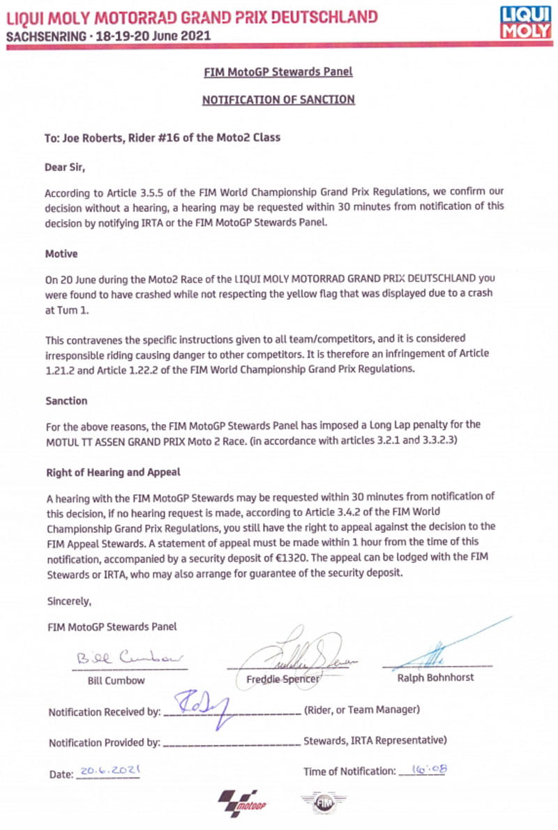C’est ce qui est arrivé à Joe Roberts dans le dernier tour du Grand Prix d’Allemagne au virage #1, là où Xavi Vierge venait de tomber. En conséquence, le californien devra effectuer un Long Lap à Assen.