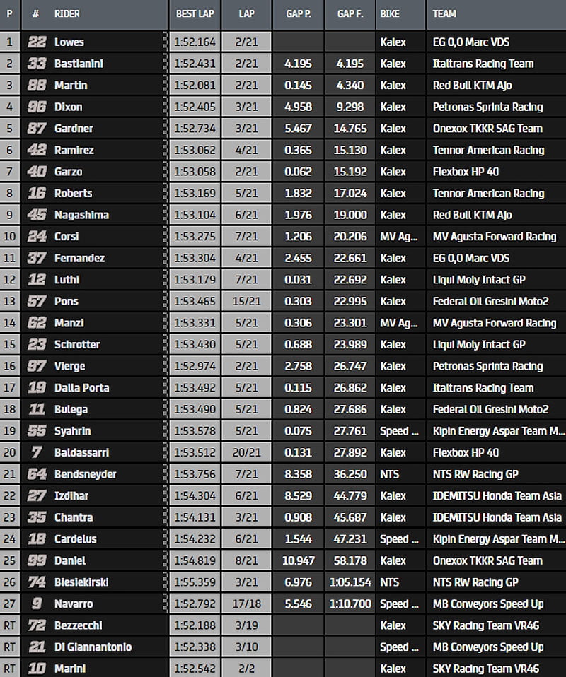 Martín passe donc virtuellement sur le podium, ce qui serait une belle récompense pour lui après deux résultats blancs ainsi que deux Grands Prix manqués puisqu’il avait été testé positif au coronavirus. Derrière, Bastianini et Dixon complètent le top 5. Viennent ensuite Ramírez, Gardner, Garzó, Roberts et Tom Lüthi.
