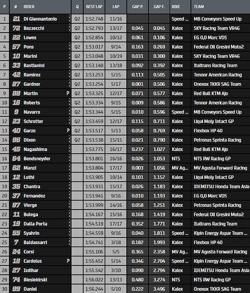 Les 14 pilotes qui intègreraient la Q2 au vu de leurs chronos actuels seraient: Lowes, Marini, Bezzecchi, Di Giannantonio, Ramirez, Gardner, Roberts, Navarro, Martin, Garzo, Pons, Bastianini, Schrotter et Dixon.