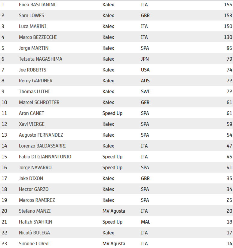 Pendant ce temps, Sam Lowes se refaisait une belle santé et Bastianini, parti douzième, finissait second, une position qui lui permettait de prendre les commandes du classement général… « Je suis vraiment déçu » déclarait Bezzecchi. « Nous avons été forts tout le week-end, nous avons fait une belle course et avons réussi à imposer notre rythme et cette chute est vraiment difficile à accepter maintenant. Nous devons analyser les données, comprendre ce qui s’est passé et se remettre à travailler dur pour le prochain GP ».
