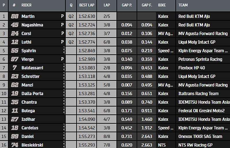 C’est « Martinator » (Jorge Martin) qui signe le chrono de référence en 1.52.630s. Les 3 autres pilotes les plus rapides qui le rejoindraient en Q2 sont: Baldassari, Vierge et Syahrin.