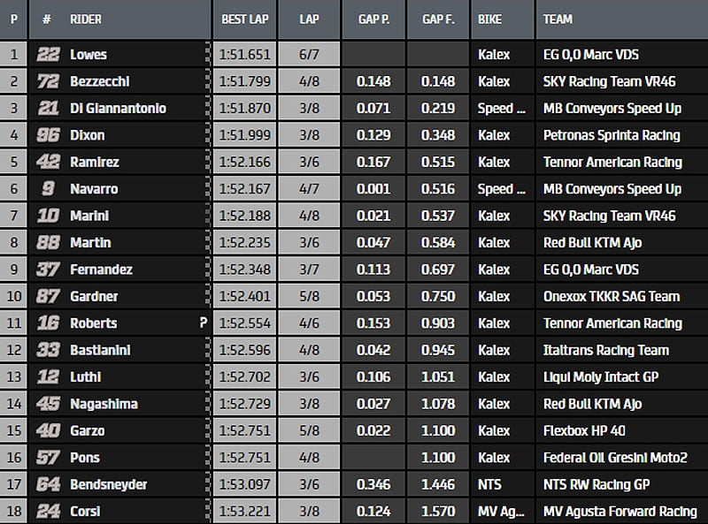 La Q2 sera aussi directement l’apanage de Bo Bendsneyder (NTS RW Racing GP), Luca Marini (Sky Racing Team VR46), Héctor Garzó (Flexbox HP40) et Edgar Pons (Federal Oil Gresini Moto2).