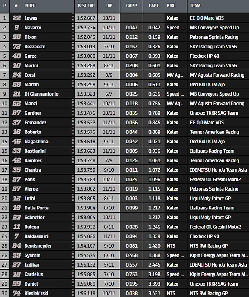 Lowes pousse encore et améliore en fin de session. Il boucle en 1.52.687s. Derrière, suivent Navarro, Dixon, Bezzecchi et Garzo.