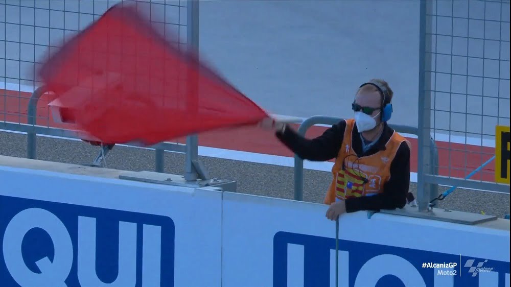 Edgar Pons chute et prévient aussitôt ses collègues que sa moto est au milieu du virage 8… Il était second, derrière Sam Lowes et devant Bezzecchi.  Le drapeau rouge est mis après cet incident pour nettoyer le virage 8 chargé de graviers.