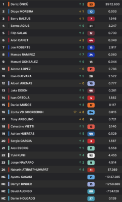Derrière lui, Aron Canet se défait de Diogo Moreira, et revient sur le Turc. Les quatre premiers évoluent à un rythme bien supérieur, et compte déjà une seconde d’avance sur la cinquième place d’Alonso Lopez après quatre tours.