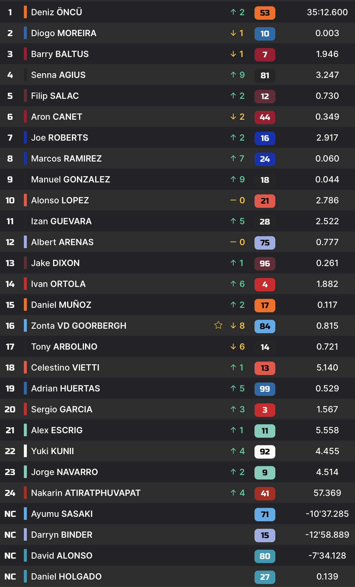 Alors que Barry Baltus hausse le ton, seul Deniz Öncü est en mesure de le suivre. Le duo de tête creuse un écart de plus d’une demi-seconde sur Diogo Moreira et Aron Canet, qui disposent toujours d’une avance confortable sur Alonso Lopez.