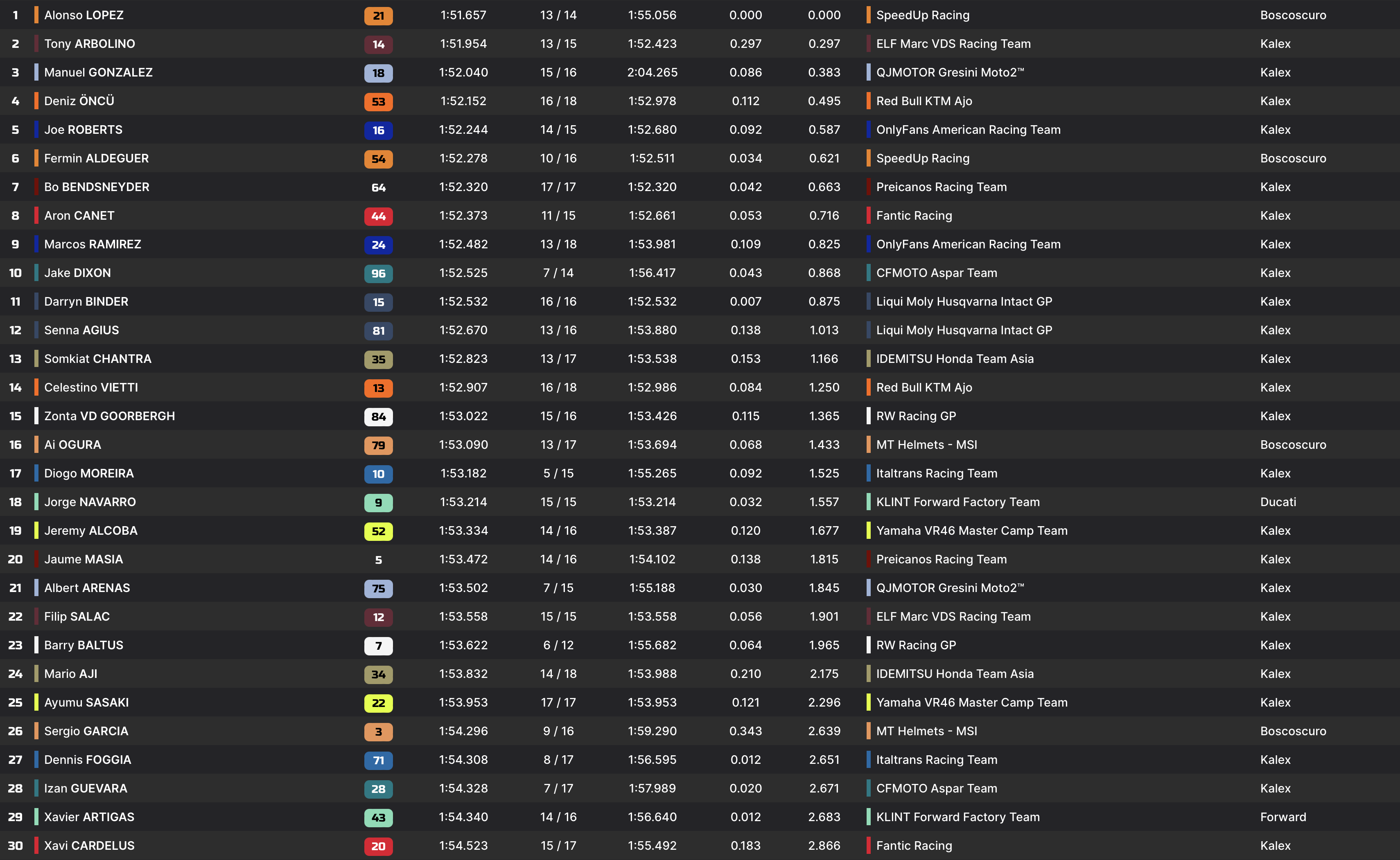 Déterminé à redorer son blason après un enchainement de mauvaises performances, Aldeguer revient à la charge. Le n°54 se met devant avec un temps trois dixièmes plus rapides que celui de Dixon. Deniz Öncü complète alors le top-3, à un peu moins de trois dixièmes de la tête.