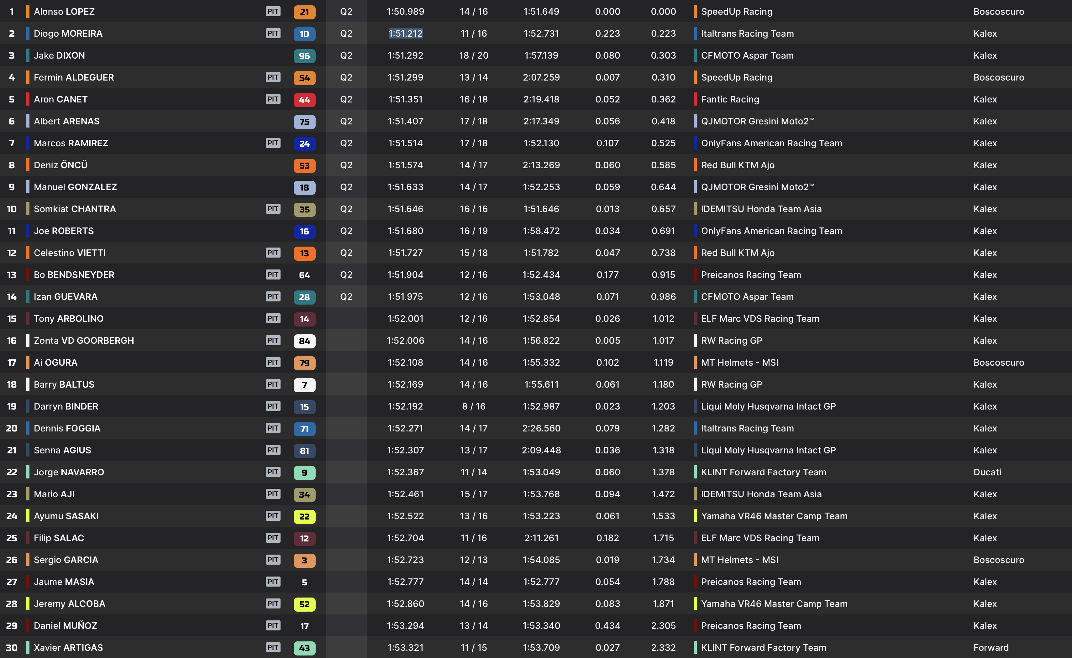 Jake Dixon est alors troisième, à 8 dixièmes, et ne semble déjà plus pouvoir lutter pour pareil classement. La menace viendra en effet d’ailleurs, puisque Diogo Moreira s’empare de la tête du classement dans les dernières minutes après une tentative en 1:51.212.