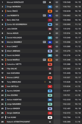 Joe Roberts complète l’un de ses meilleurs vendredi de l’année, avec le quatrième temps. Barry Baltus complète le top-5, et se qualifie aussi pour la Q2. Son équipier, Aron Canet, fait aussi partie du top-14, revendiquant le 11e rang. Malgré sa chute, David Alonso conserve le 13e temps. Il minimise donc les dégâts, et ne devra pas passer par la Q1.