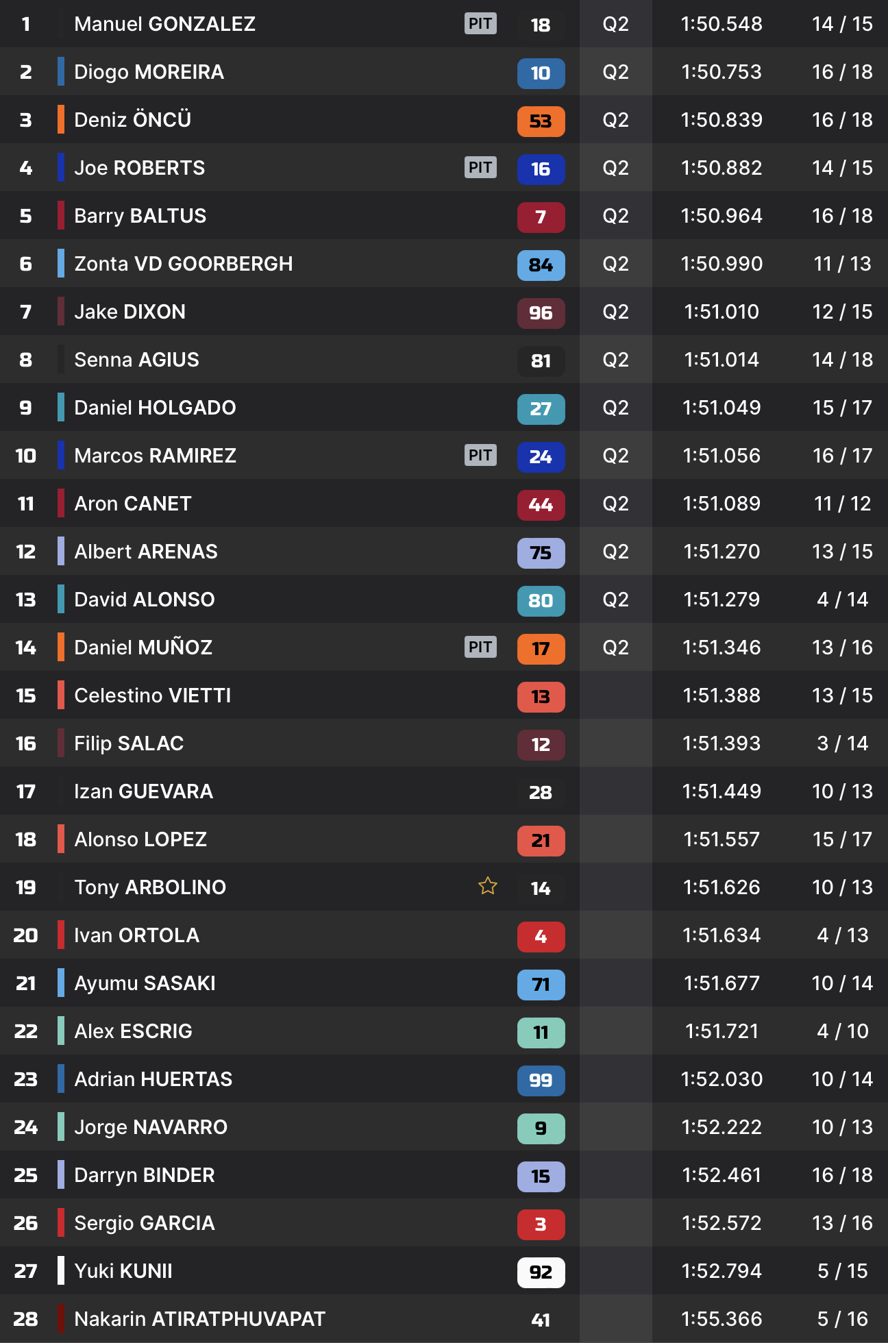En début de séance, les pilotes de tête évoluent dans les mêmes chronos que ceux établis ce matin. Le top-4, composé par Aron Canet, David Alonso, Deniz Oncu et Manuel Gonzalez, est d’ailleurs le même que dans la matinée, bien que l’ordre ne cesse de changer. Gonzalez, Canet et Oncu revendiquent ainsi la tête à tour de rôle.