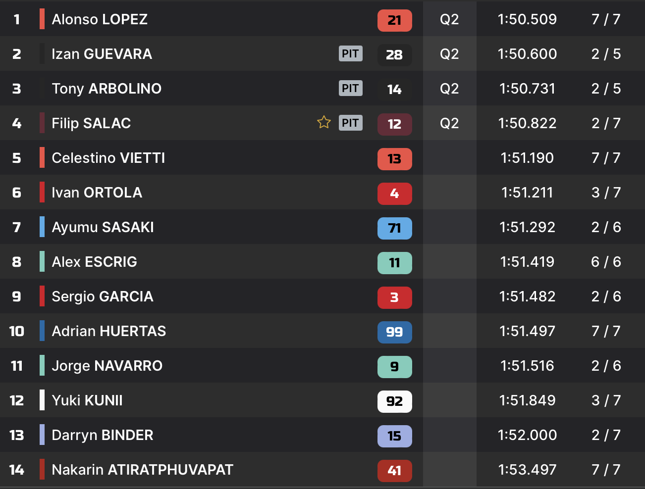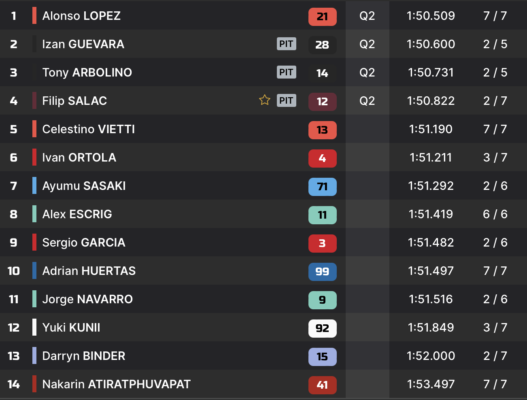 Avant même la fin de séance, l’un des favoris est déjà hors-course. Après sa chute, Manuel Gonzalez ne peut repartir, étant donné les dommages subis. N’ayant pas enregistré le moindre chrono en Q2, il termine dernier de la séance, et partira 18e de la Course du week-end.
