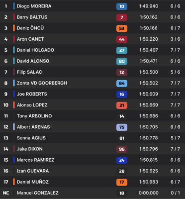Côté chrono, Aron Canet crée la surprise, en s’emparant de la tête du marquoir au terme des premières tentatives. Le n°44, qui dispose d’une belle occasion de reprendre les commandes du championnat ce week-end, tourne en 1:50.220. Il relègue ainsi son plus proche poursuivant, Diogo Moreira, à plus de 4 dixièmes. Alonso Lopez, fraîchement sorti de la Q1 complète le top-3 provisoire devant le dernier vainqueur en date, Senna Agius : les deuxièmes salves de chrono s’annoncent palpitantes.