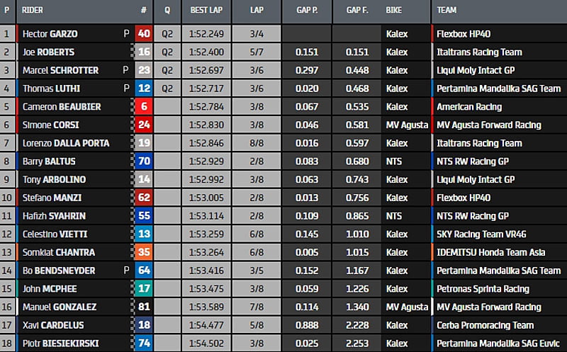 Garzo, Roberts, Schrotter et Luthi sont les 4 pilotes qualifiés qui rejoignent les 14 autres pilotes les plus rapides pour la Q2.