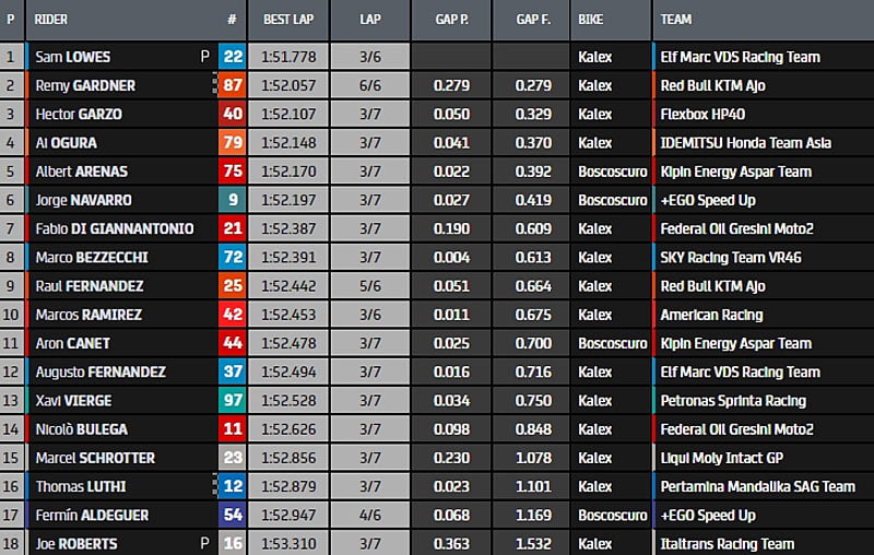 Mais le Britannique Sam Lowes vient bousculer tout ce petit monde, il prend la main en 1.51.778s. il devance Garzo, Ogura, Arenas et NavarroGardner se classe provisoirement à la 14e position.