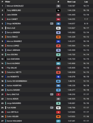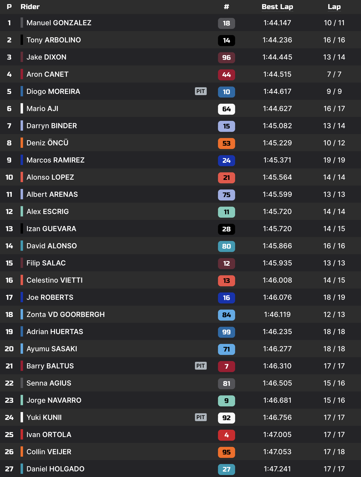 Ils se feront malgré tout voler la vedette par Manuel Gonzalez, venu signer un chrono en 1:44.147 devant le drapeau à damier. Tony Arbolino et Jake Dixon complètent le top-3 dans cet ordre.