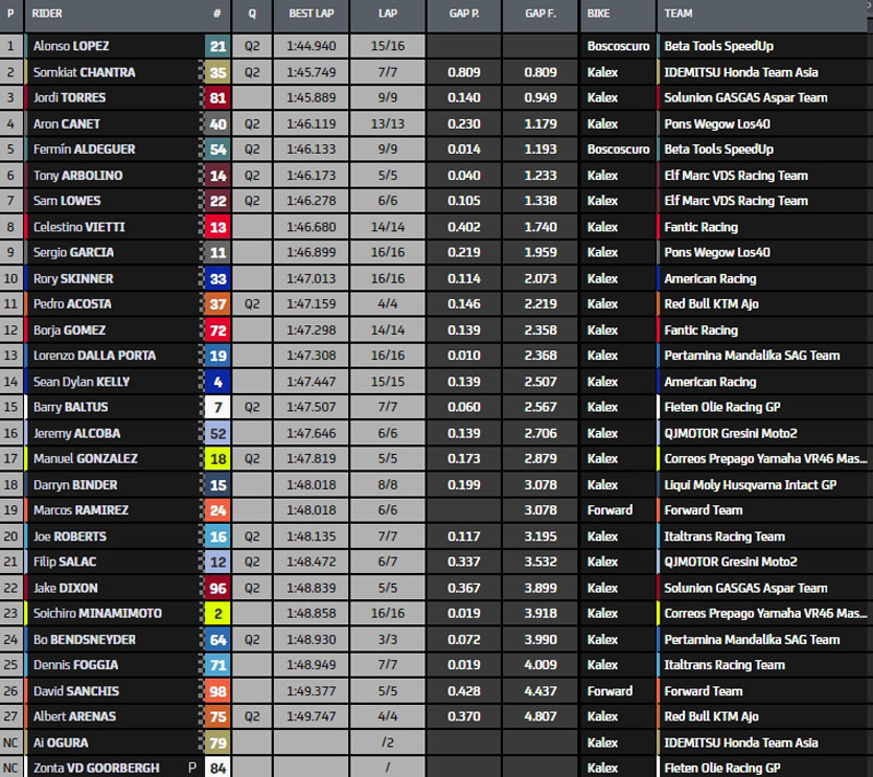 Derrière lui Somkiat Chantra (Team Asia), Aron Canet (Pons), Sam Lowes (Marc VDS) et Fermin Aldeguer (Speed ​​Up). Le Top Ten est fermé par Bo Bendsneyder (SAG) et Alonso Lopez (Speed ​​Up). Manuel Gonzalez (VR46 MasterCamp, le plus rapide des FP1), Albert Arenas (Red Bull Ajo), Barry Baltus (Racing GP) et Joe Roberts (Italtrans) se sont également qualifiés pour la Q2 provisoire.