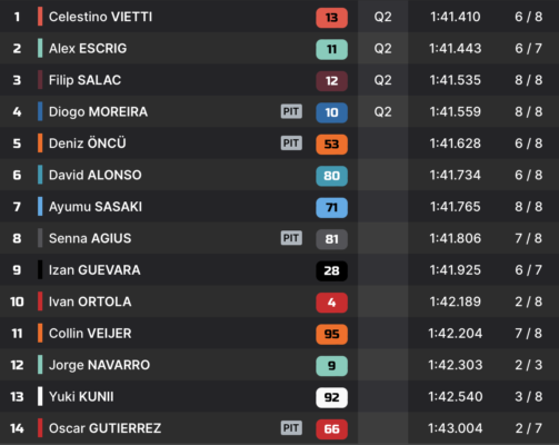 Cette Q1 riche en rebondissements n’a cependant pas fini de nous surprendre. Devant le drapeau à damier, une poignée de pilotes s’élancent pour un ultime effort. En fin de séance, Celestino Vietti reprend la tête avec un chrono en 1:41.410, plus rapide que celui établi par Jake Dixon dans la matinée.