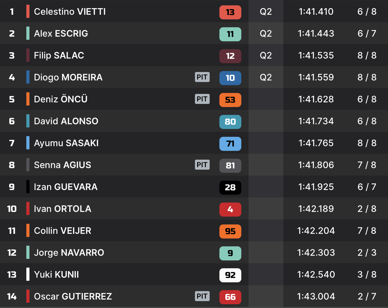 | Q1 | 1’43.404 Darryn Binder | 1’41.410 Celestino Vietti |