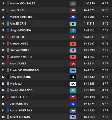 | FP2 (ex-P2) | 1’44.940 Alonso López | 1’41.486 Jake Dixon |