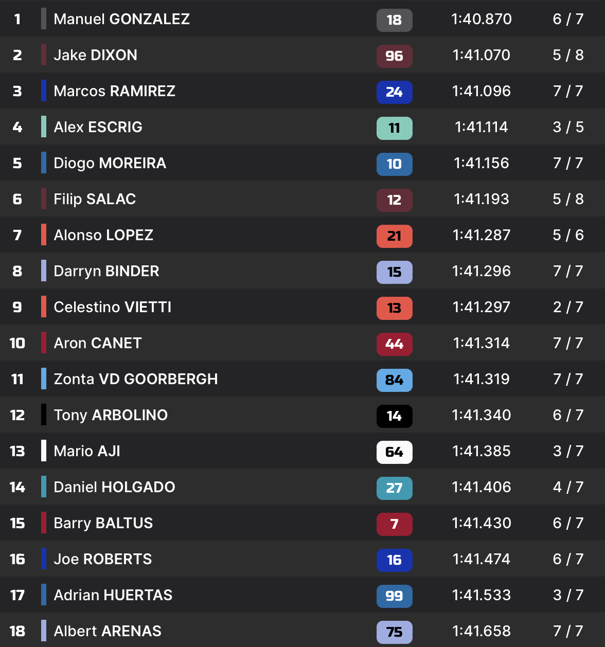 La réelle menace vient cependant de Manuel González. L’Espagnol achève cette première salve de chronos en 1:41.120, et explose le record du tour pour se mettre en pole provisoire.