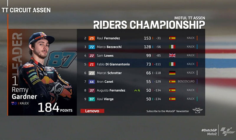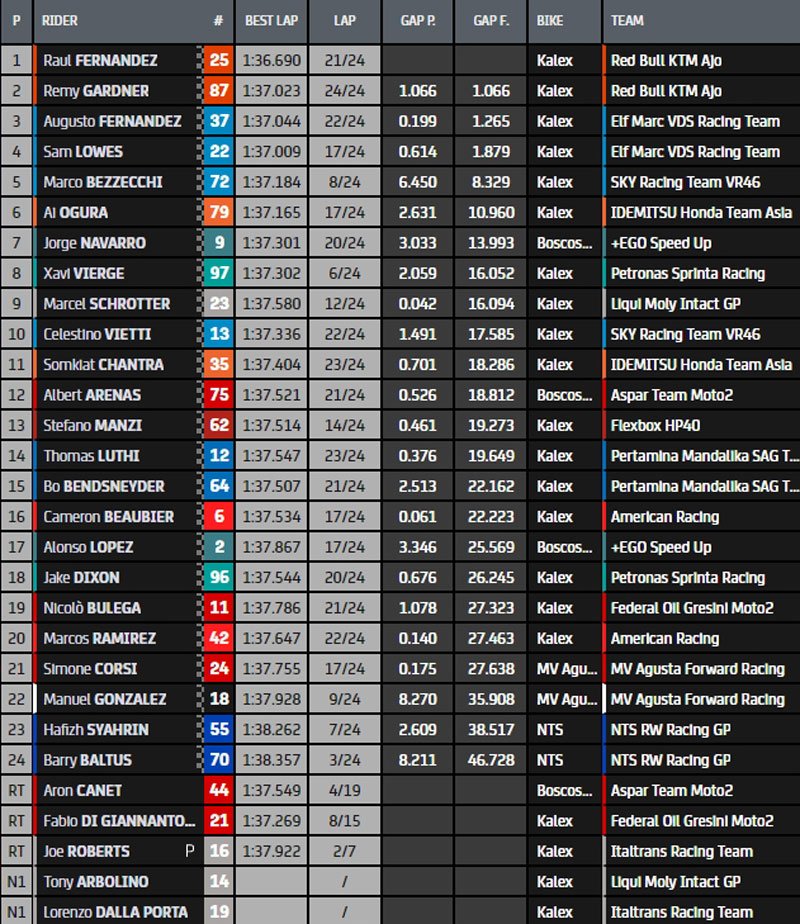 Au championnat, Remy Gardner conserve 31 points d’avance sur Raúl Fernández et 56 sur Marco Bezzecchi qui termine 5e de cette course, devant le peloton.